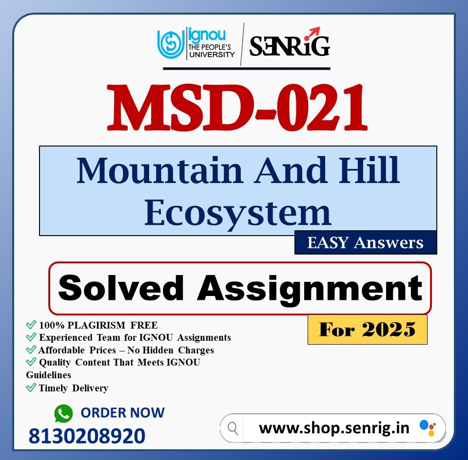 IGNOU MSD-021 Solved Assignment 2025 PDF (English) If you🌟 Struggling with Your MSD-021 Mountain and Hill Ecosystem Assignments? We’ve Got Your Back! 🌟 IGNOU Mountain and Hill Ecosystem (Latest PDF) Download ,MSD-021 assignment solution 2025. IGNOU MASS assignment 2025, MSD-021 assignment pdf. Buy Now and Get Best Results. MSD-021 solved assignment English pdf download, buy MSD-021 latest assignment.